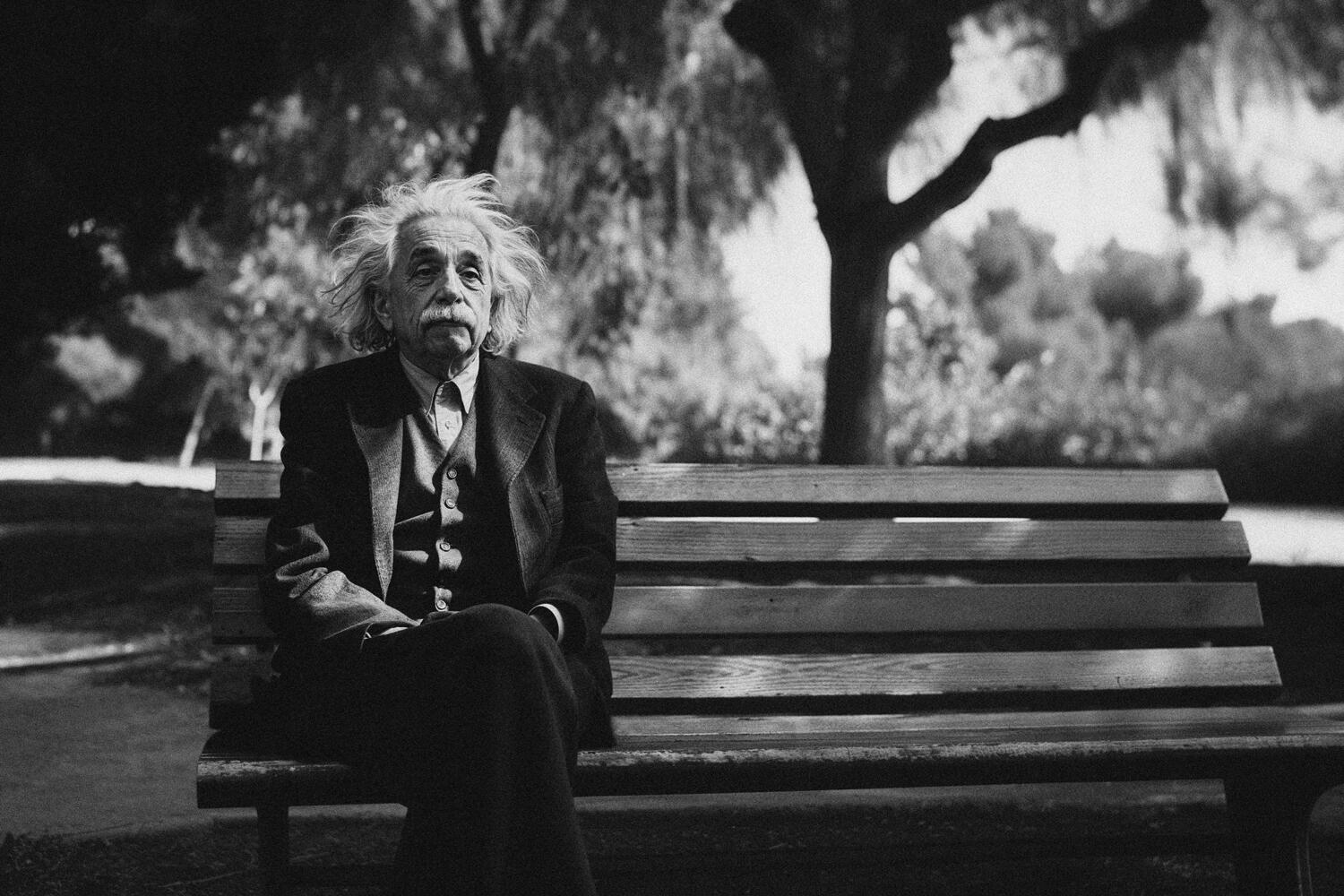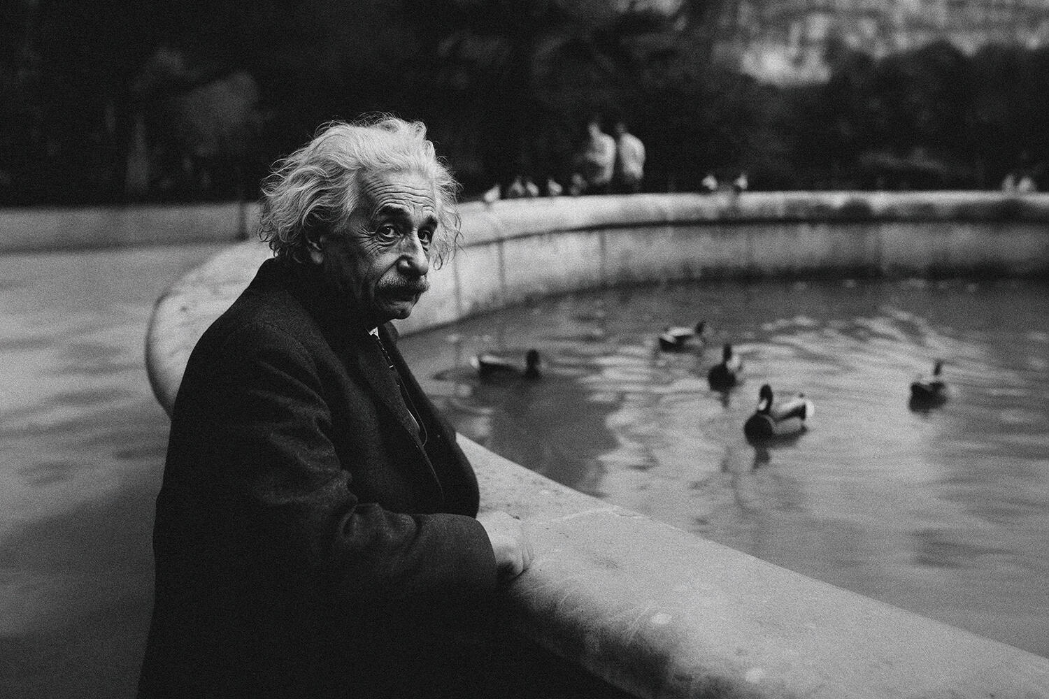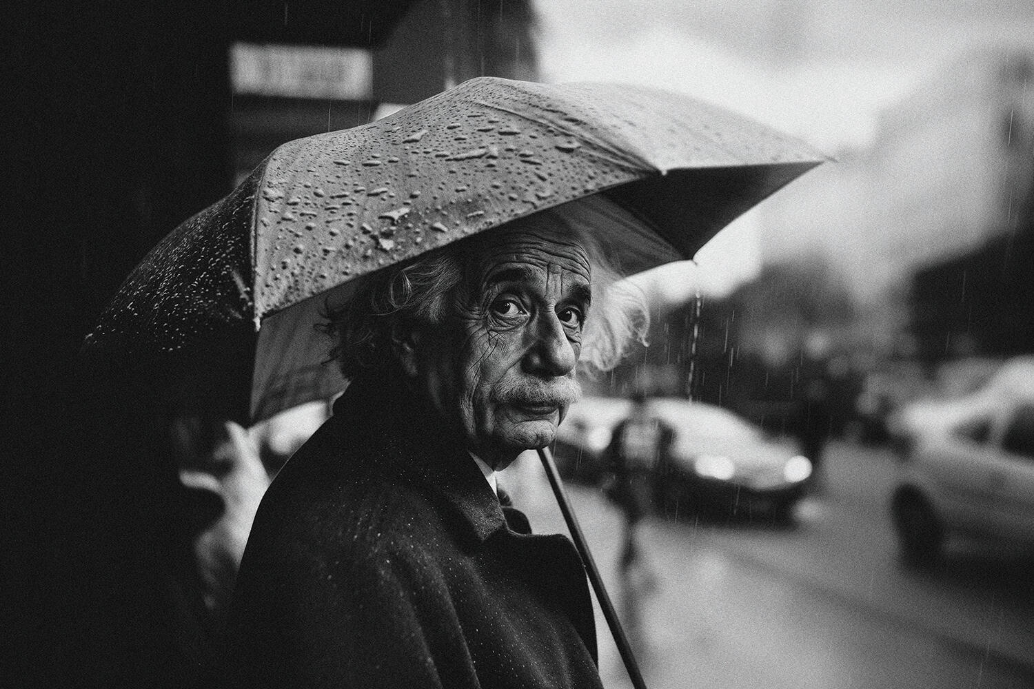 Evoking vintage silver gelatin photography, this collection places Einstein in a modern metropolis. These quiet, anonymous moments, like riding a bike or sitting in a park, humanise a genius within the everyday.