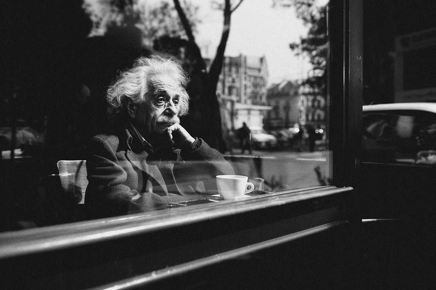 Evoking vintage silver gelatin photography, this collection places Einstein in a modern metropolis. These quiet, anonymous moments, like riding a bike or sitting in a park, humanise a genius within the everyday.