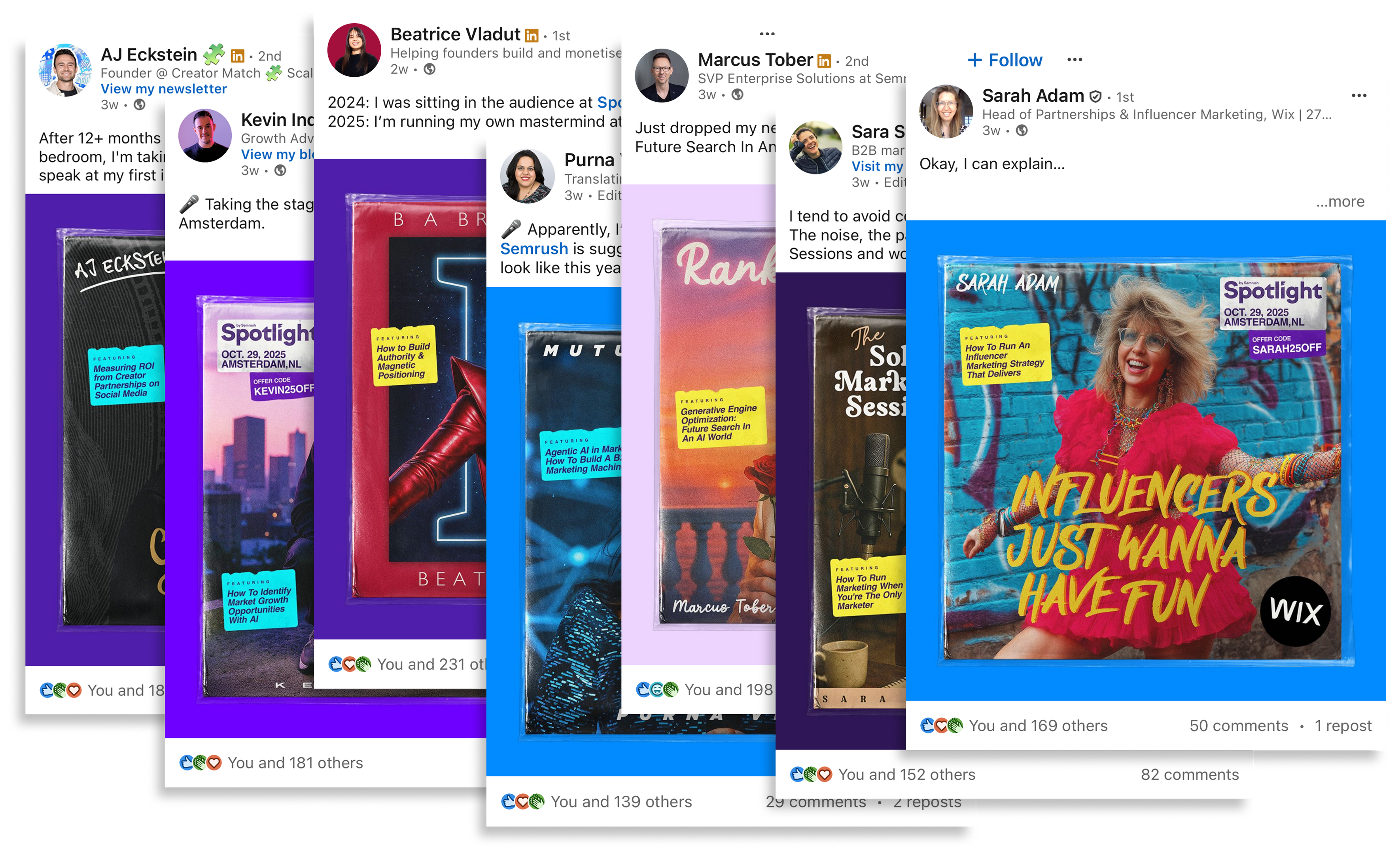 We ideated the concept of treating each speaker as a solo artist, using generative AI to craft bespoke album cover mockups that reflected their unique professional personas.By providing an asset that felt like a personalized tribute rather than just a promotional tool, we achieved an organic sharing rate that set a new benchmark: the highest percentage of speakers posting about an event in Semrush history.